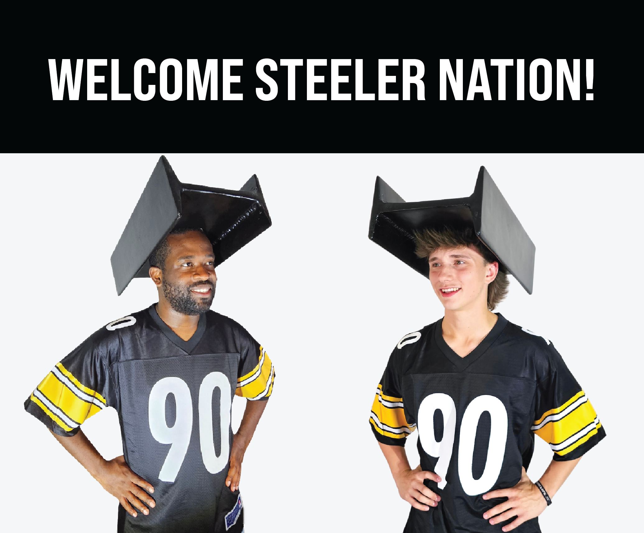 Inspired by the Steelers logo history of American Iron and Steel Institute an I-beam was transformed into the perfect headgear to cheer on the Pittsburgh Steelers!